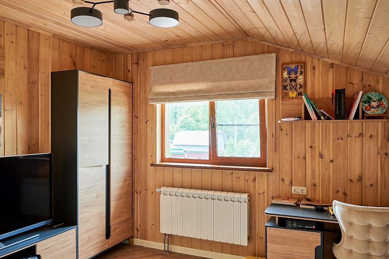 При необходимости шторы можно сочетать с жалюзи или шторами-плисе. Этот вопрос особенно актуален для комнат, окна которых не защищены листвой. Хорошую светозащиту обеспечивают также текстильные шторы из ткани блэкаут.