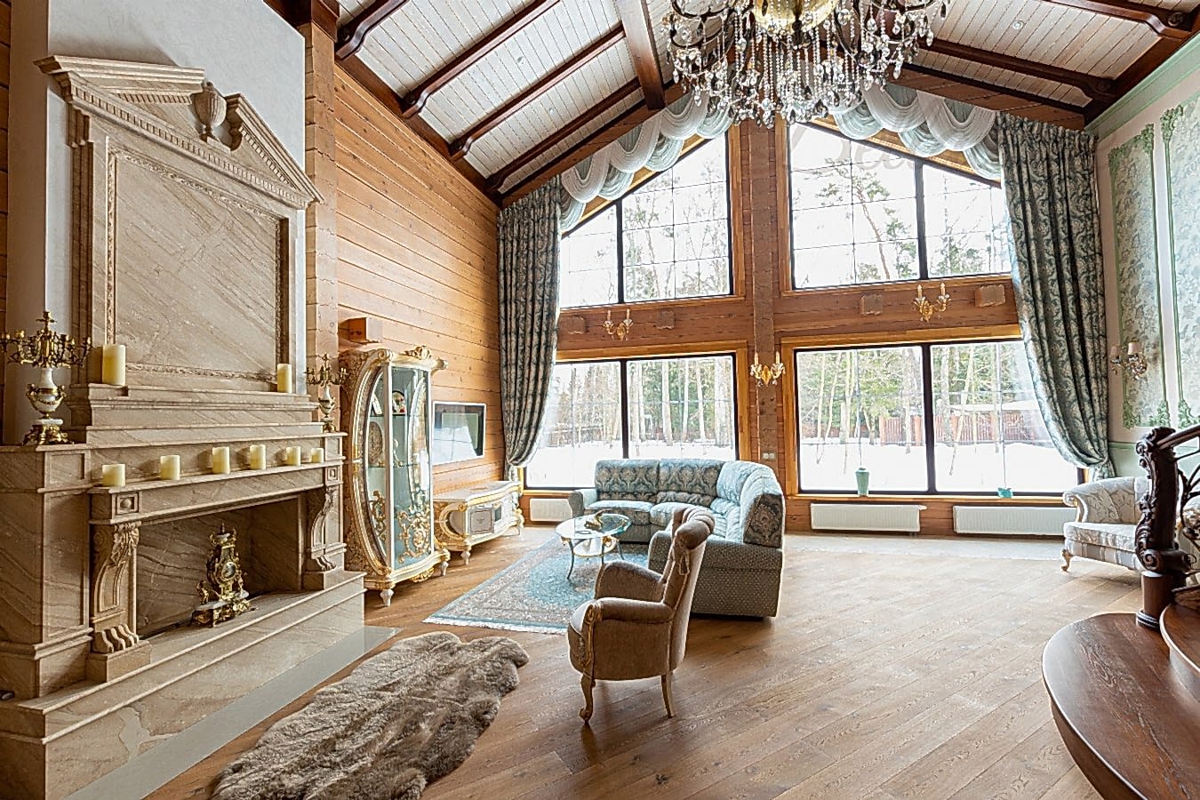 - Панорамное окно- в виде пятиугольника, чаще всего форма «домика». Оно может занимать всю стену от пола до крыши, сочетаясь с балконом или террасой. Панорамные окна с PinUp верхом встречаются не только на верхнем этаже, но и на первом, в пристройках с двускатными крышами.