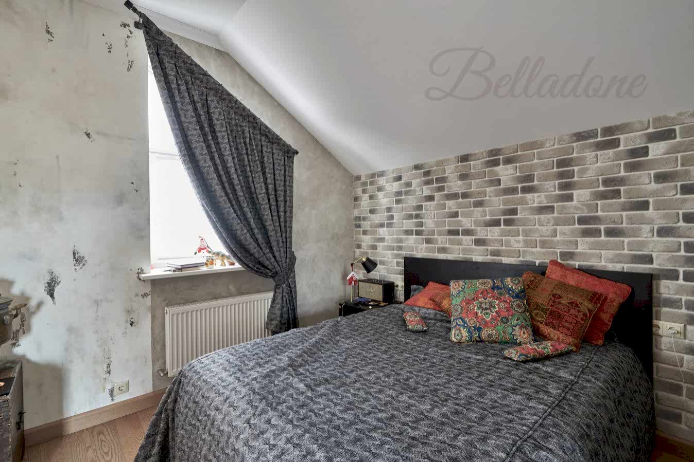 - Если треугольное окно предусмотрено дизайнерским решением, а не вызвано особенностью PinUp можно использовать горизонтальный карниз, выбирая шторы, подходящие для прямоугольных окон.
